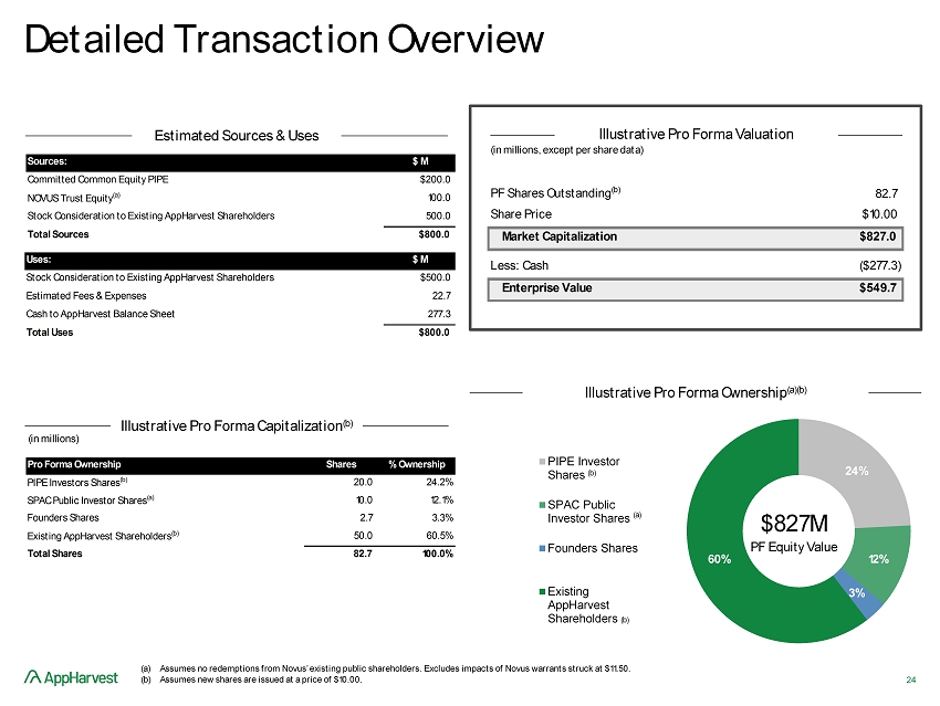 - The business combination values AppHarvest at a $827.0 million pro forma equity value, at the $10.00 per share PIPE price and assuming minimal redemptions by Novus Capital shareholders.