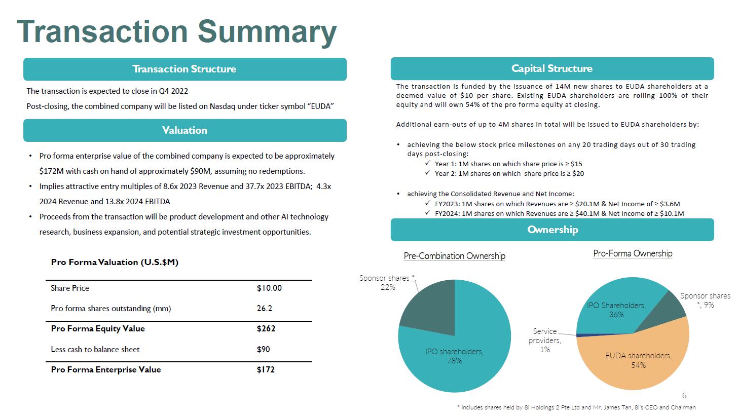 - 9 million total shares will be awarded post-transaction close if EUDA’s share price reaches $15, $20 and $25 over three years.