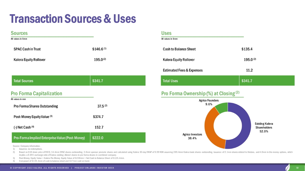 • In addition to shares of Agrico common stock, Kalera shareholders will receive one contractual Contingent Value Right per share of common stock that will entitle them to receive up to two stock payments upon the achievement of certain milestones. Each stock payment will consist of shares representing 5% of the fully diluted equity of Kalera at the date of completion of the Transaction.