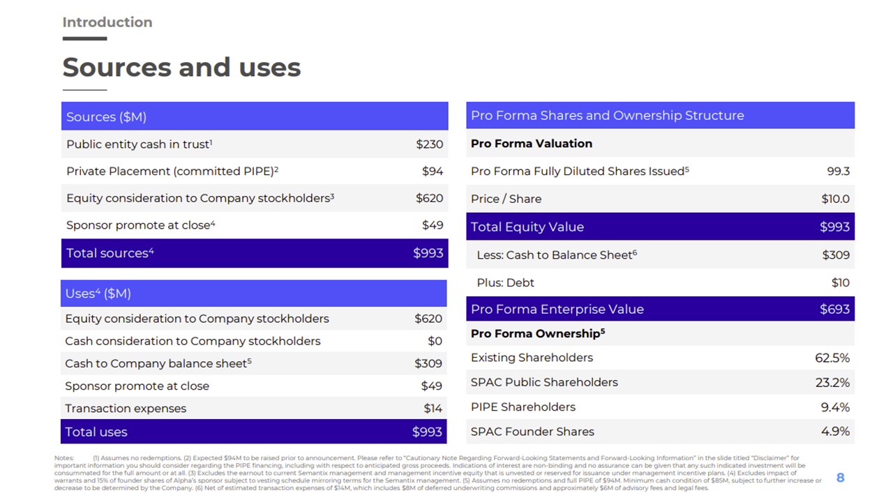 - The combined company will have a pro forma enterprise value of $693 million, assuming a $10.00 per share price and no shareholder redemptions. The transaction is funded with $324 million, including $230 million from the Alpha Capital trust (assuming no redemptions).