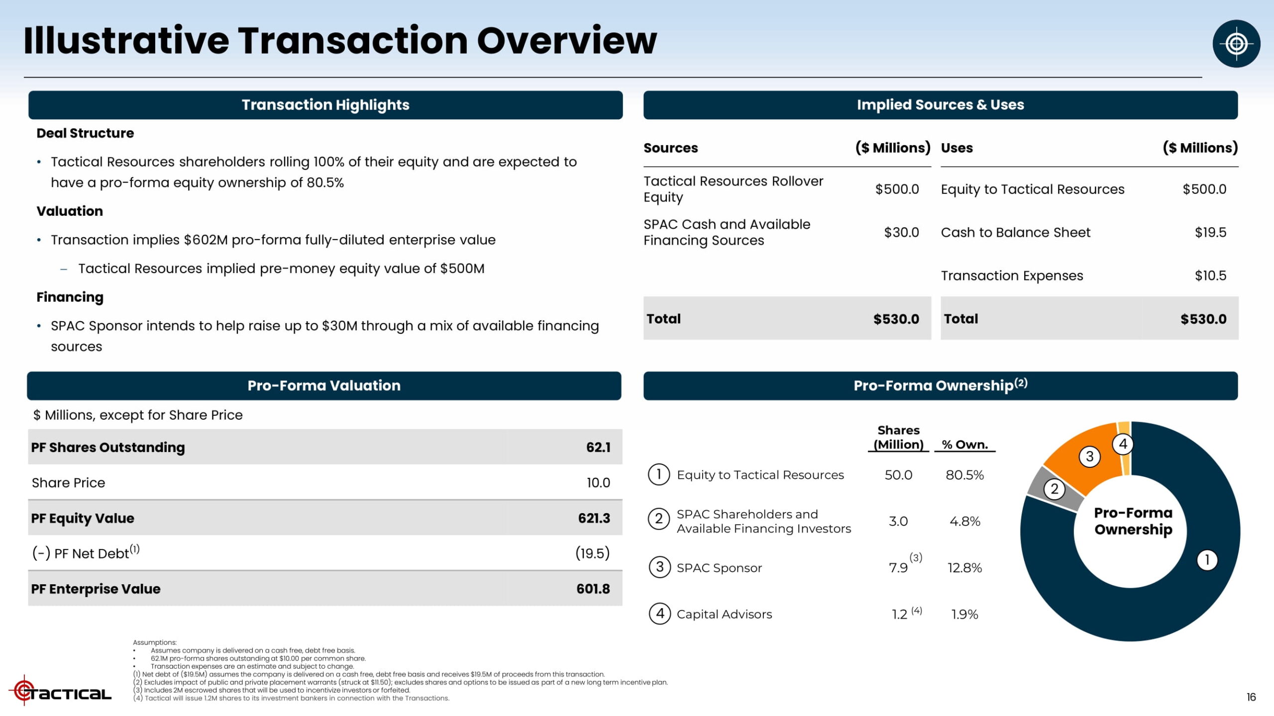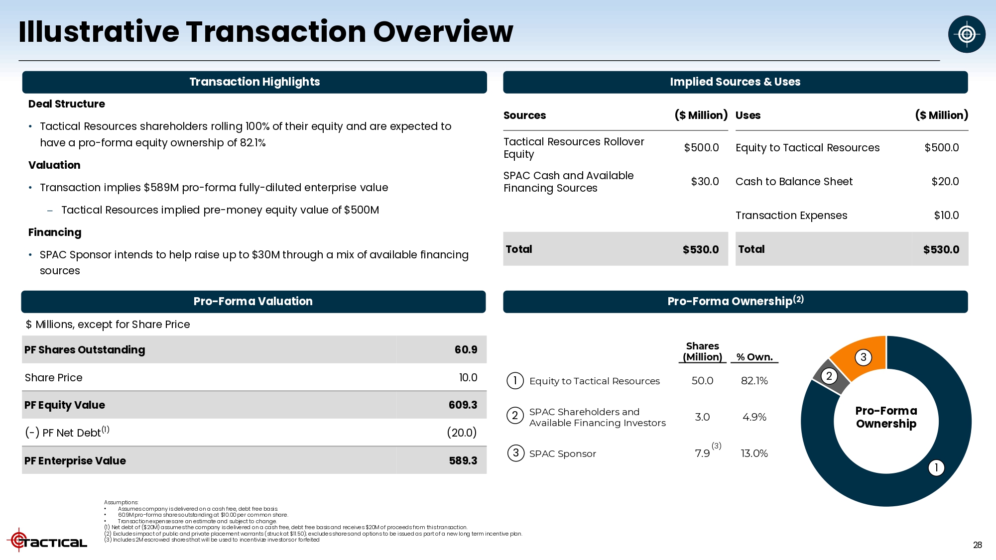 - The Proposed Business Combination implies a pro forma enterprise value of $589 million, assuming Tactical Resources is delivered on a cash free, debt free basis.