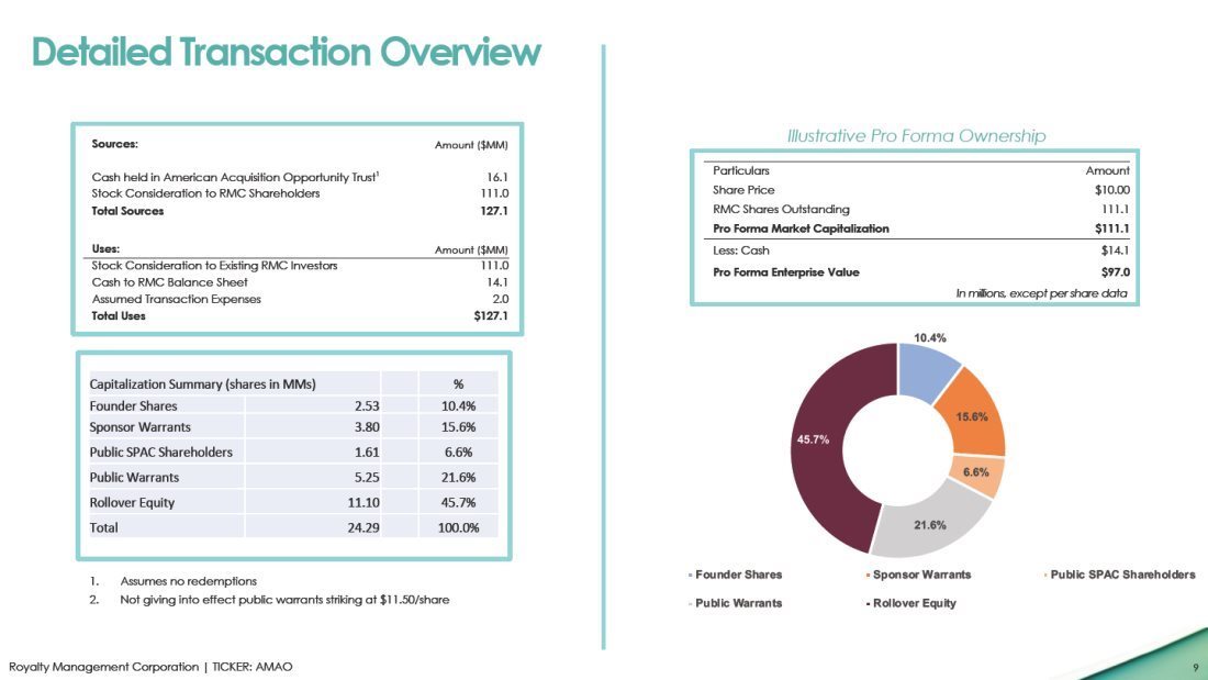 - The business combination values RMC at an implied $97 million pro forma enterprise value, at a price of $10.00 per share, assuming no redemptions by AMAO shareholders.