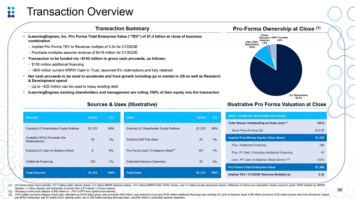 - iLearningEngines will receive proceeds of a private convertible offering with participation from Arrowroot Capital and other institutional investors at the time the transaction is announced.