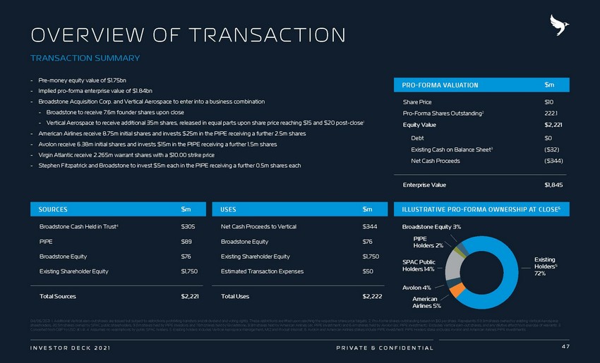 - Mudrick Capital Management, LP (“Mudrick Capital”), a global investment firm focused on special situation investing, will invest $200 million in Vertical through convertible senior secured notes. In addition, Kouros SA, a firm specializing in investments to decarbonize transport and energy production, will invest $5 million in Vertical’s PIPE alongside American Airlines, Avolon, Honeywell, Microsoft’s M12 and Rolls-Royce.