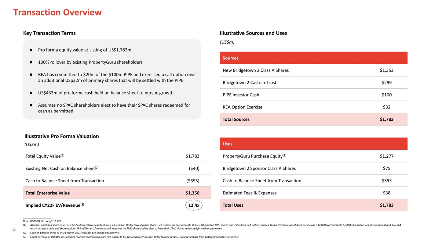 • The transaction is expected to deliver up to US$431 million of gross proceeds through the contribution of up to US$299 million of cash held in Bridgetown 2’s trust account, a concurrent US$100 million private placement (“PIPE”) of common stock anchored by Baillie Gifford, Naya, REA Group, Akaris Global Partners, and one of Malaysia’s largest asset managers, priced at US$10.00 per share, and an additional US$32 million equity investment from REA Group.