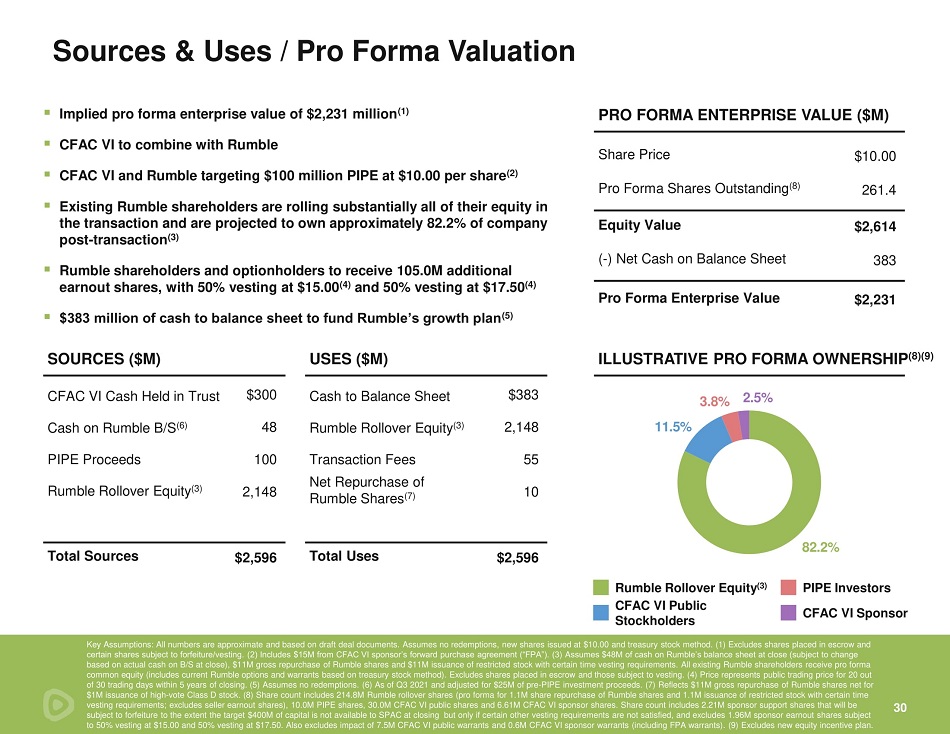 - The transaction is expected to provide approximately $400 million in proceeds5 to Rumble, including a fully committed PIPE of $100 million at $10.00 per share and $300 million of cash held in the trust account of CFVI.