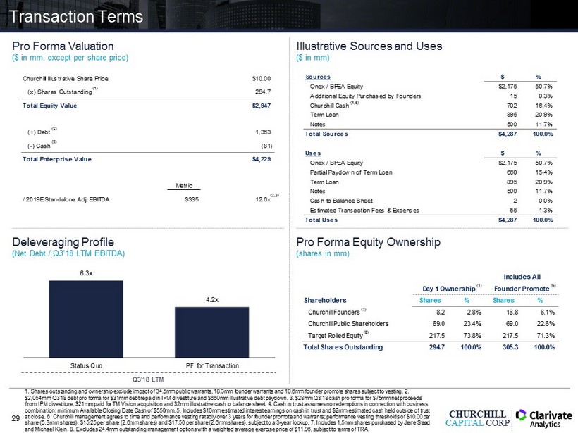 - Onex, BPEA and Clarivate management are retaining 100% of their equity, which converts to 73.8% ownership of the outstanding shares of the combined company at closing, assuming no redemptions by Churchill’s public stockholders.