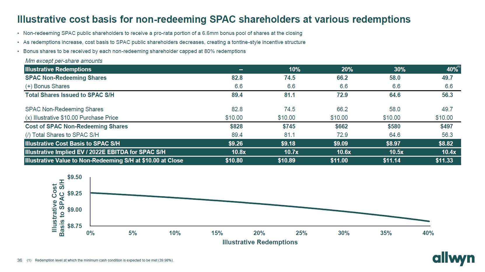 - Bonus shares forfeited by redeeming shareholders will be distributed to non-redeeming shareholders on a pro rata basis, which is variable based on a range of exchange ratios for shares held by non-redeeming shareholders of between 1.08x and 1.40x, to be determined based on redemptions.