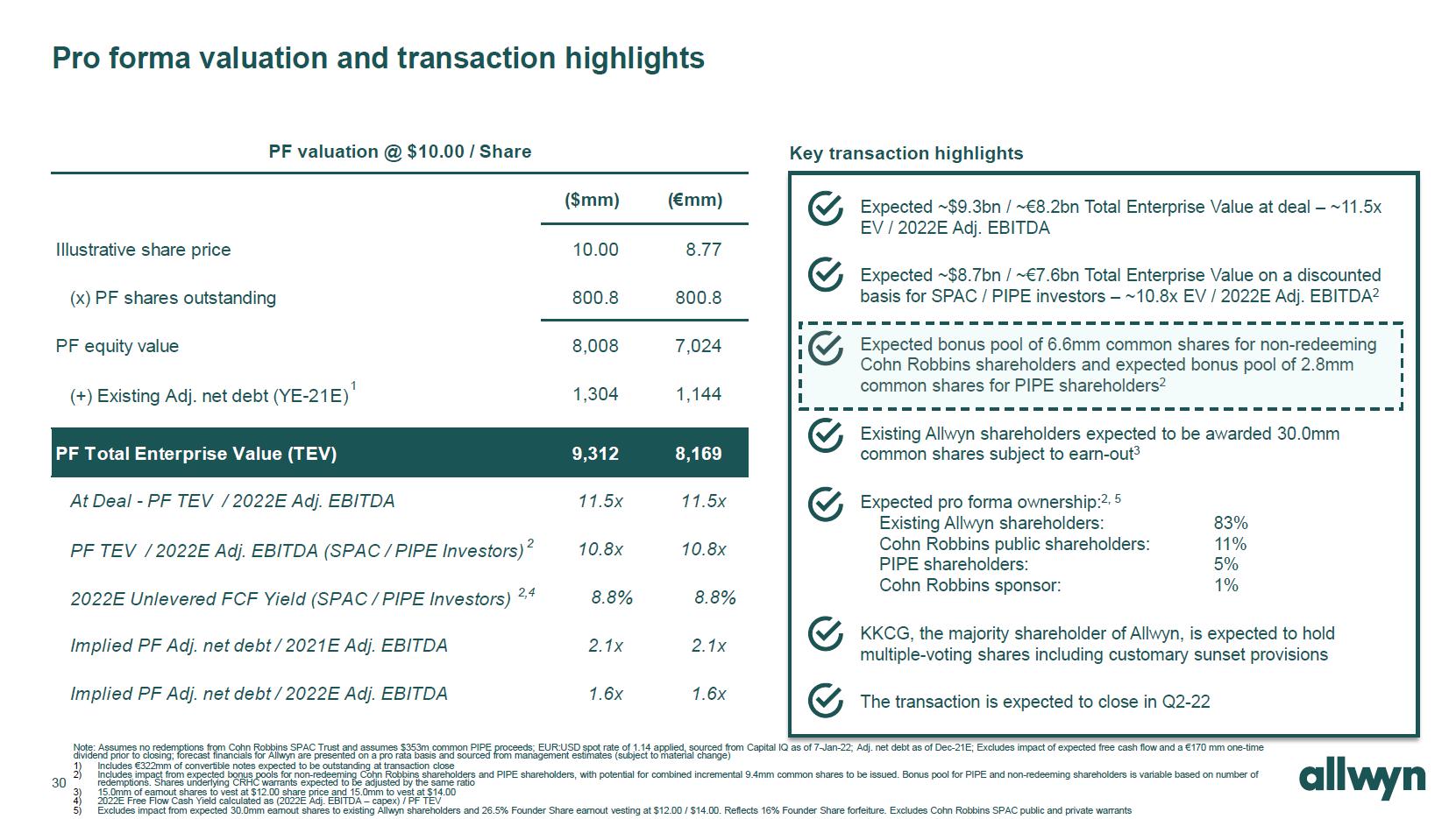 - However, due to a bonus pool of up to approximately 6.6 million CRHC shares to be made available exclusively to non-redeeming CRHC shareholders, such shareholders have the opportunity to establish ownership stakes at a maximum expected effective valuation multiple of 10.8x 2022E Adjusted EBITDA, or approximately $8.7 billion in total enterprise value.