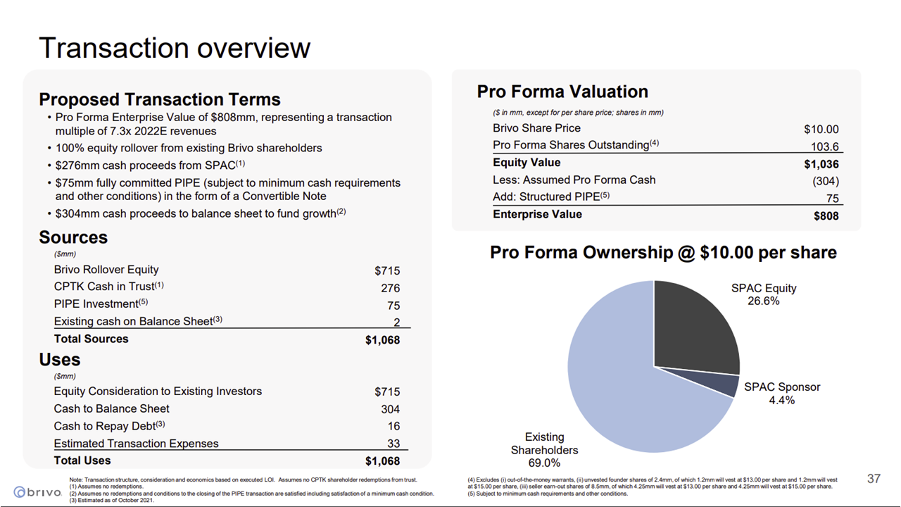- Pursuant to the Subscription Agreements, the PIPE Investors agreed to subscribe for and, in connection with the consummation of the Mergers, purchase convertible notes of New Brivo (the “PIPE Notes”) (which are convertible into New Brivo Class A Common Stock) with an aggregate principal amount of $75 million.