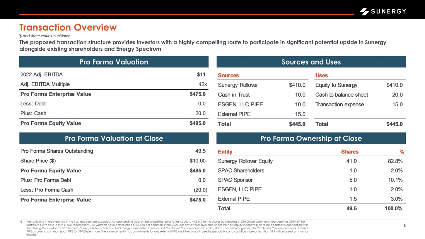 • The Transaction is currently anticipated to generate gross proceeds of up to approximately $65 million of cash, underpinned by a $10 million participation in the common stock PIPE by ESGEN’s sponsor, ESGEN LLC (to be funded by the sponsor’s affiliate Energy Spectrum Partners VIII LP (“Energy Spectrum”)) at $10.00 per share.