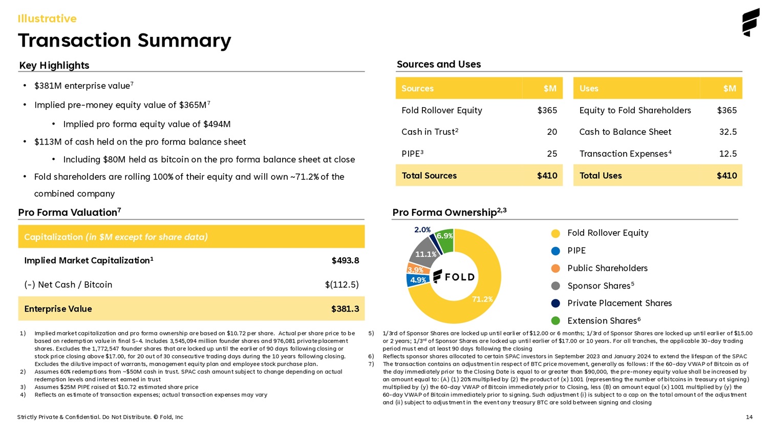 - In the event that the Company and Fold raise less than $50 million from the date of the Merger Agreement through the second anniversary of the Closing, the Sponsors shall automatically forfeit for no additional consideration up to 1,000,000 subject founder shares, as described in the Sponsor Share Restriction Agreement.