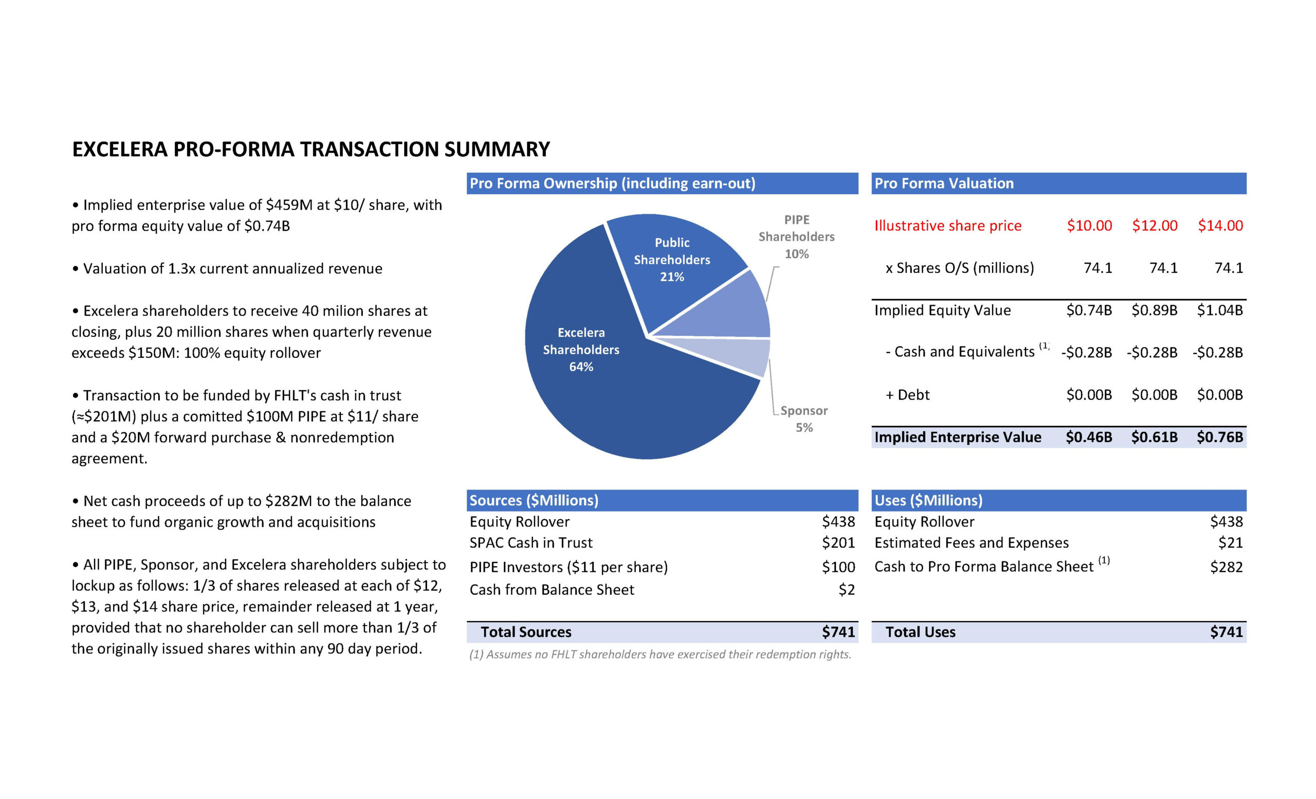 - Excelera’s shareholders will own approximately 64%, Future Health shareholders will own approximately 21%, PIPE investors will own approximately 10%, and Future Health’s sponsors will own approximately 5% of the issued and outstanding shares of common stock of the combined company.
