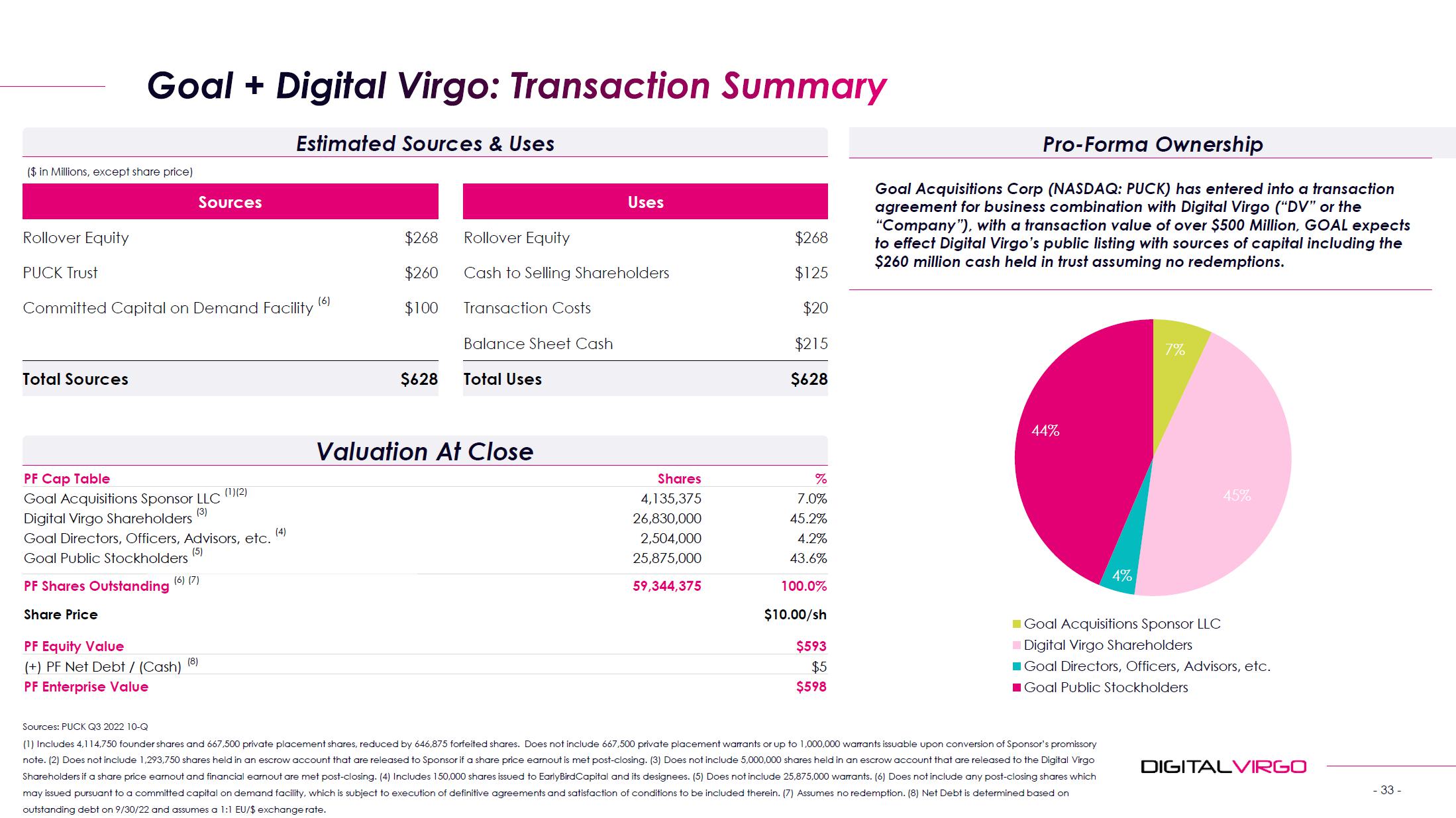- The transaction was unanimously approved by the Digital Virgo Strategic Committee and the Goal Board of Directors. It is expected to close in the first quarter of 2023