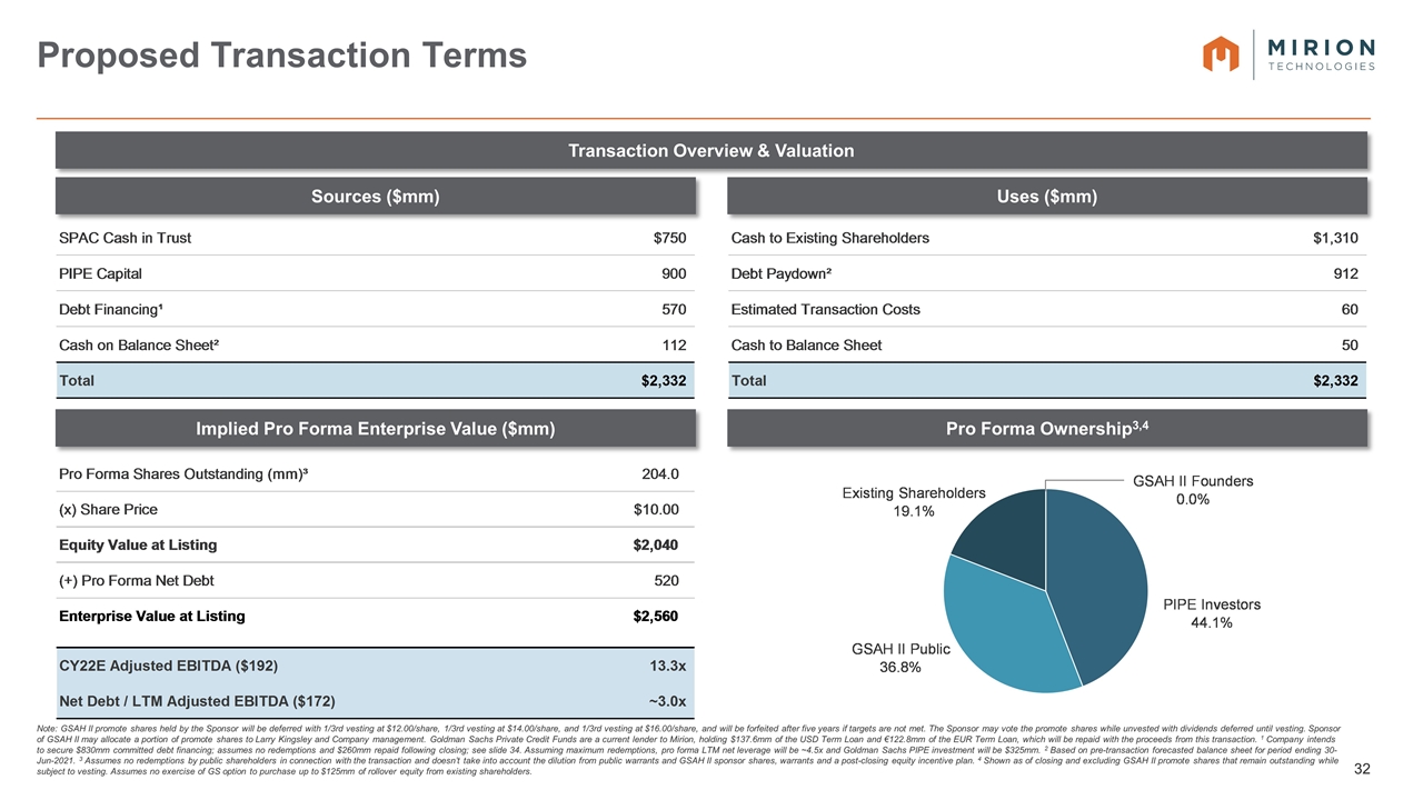- After giving effect to any redemptions by the public stockholders of GSAH, the balance of the approximately $750 million in cash held in GSAH’s trust account, together with the $900 million in private placement proceeds, will be used to pay $1,310 million in cash consideration (subject to certain adjustments) to Mirion stockholders, and to pay transaction expenses and reduce Mirion’s existing indebtedness to up to ~3.0x LTM estimated pro forma Adjusted EBITDA as of June 30, 2021.