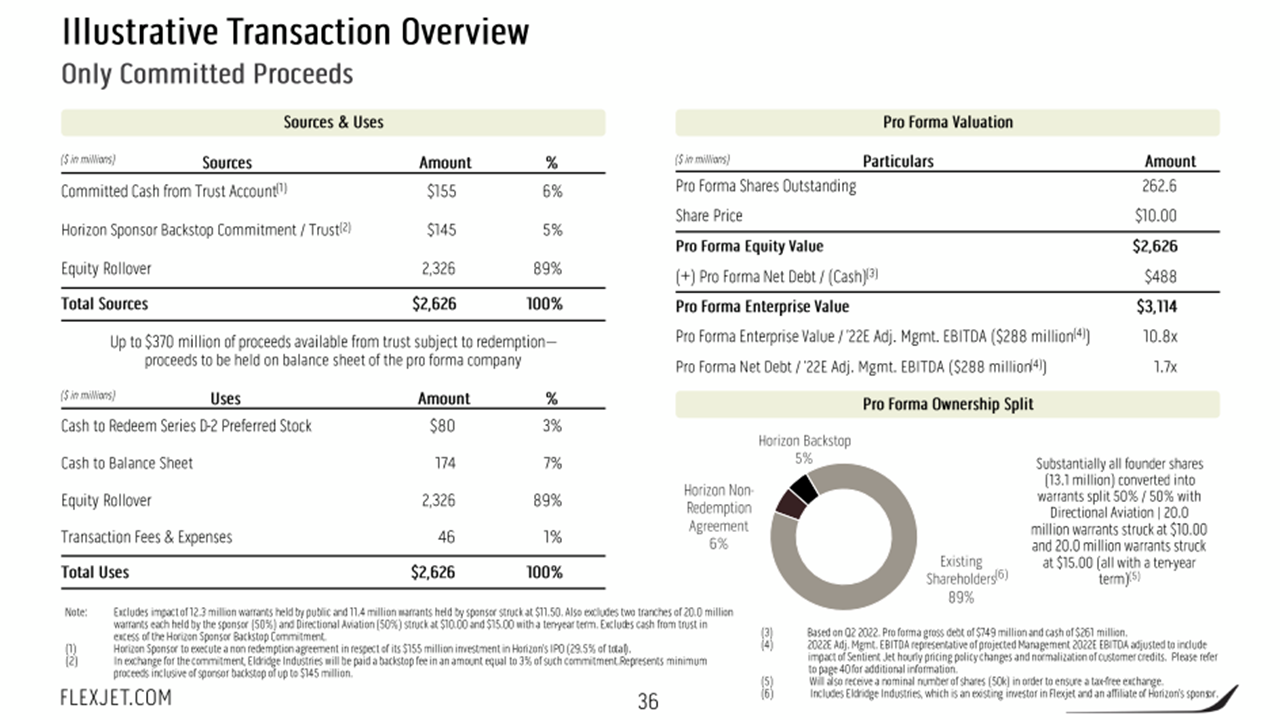 - Upon the closing of the transaction and assuming the full redemption back-stop is utilized, existing Flexjet shareholders (which includes affiliates of Eldridge Industries who are current investors in Flexjet) are expected to own 89% of the combined company. In the event there are fewer redemptions from Horizon’s trust account, such ownership percentage would be reduced by existing Horizon public shareholders.