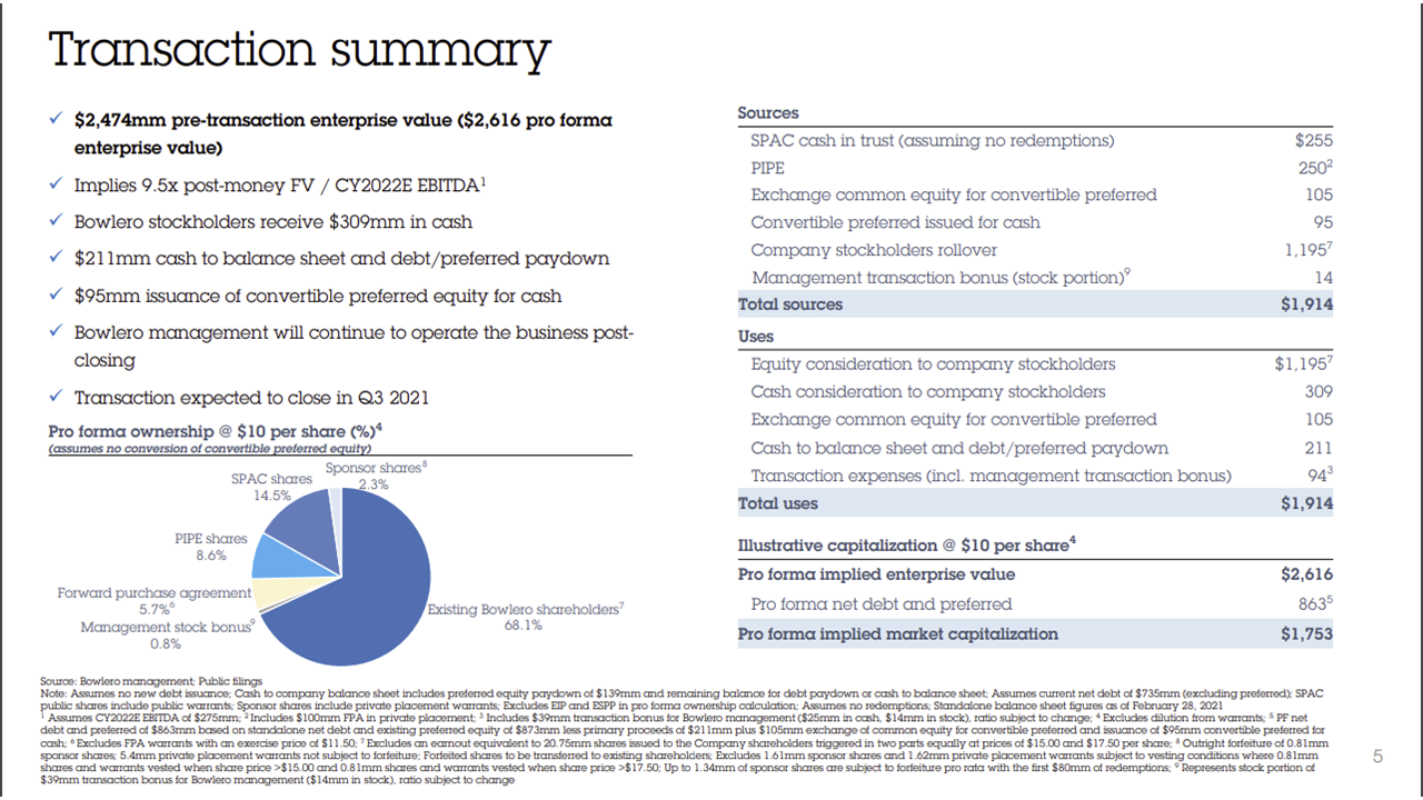 - The business combination values Bowlero at an implied $2.6 billion pro forma enterprise value.