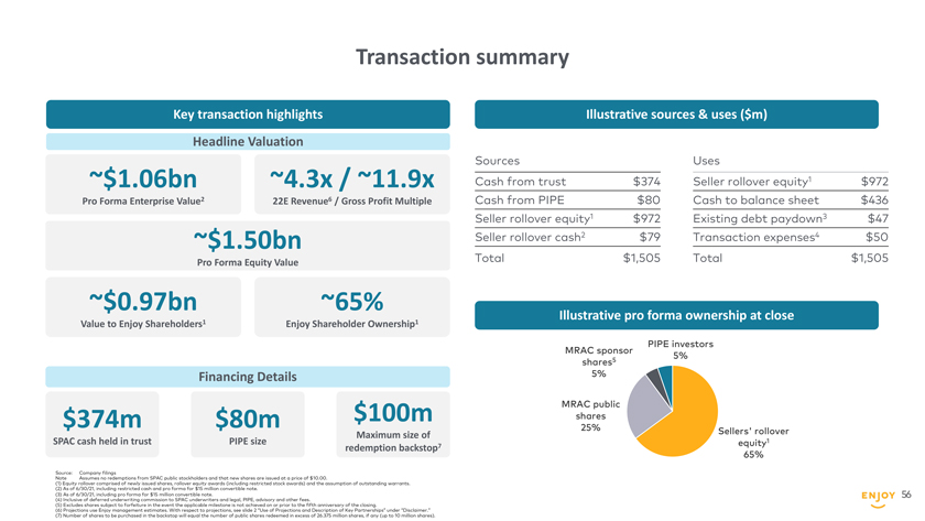 - The transaction is expected to deliver up to $454 million of gross proceeds to Enjoy, consisting of the contribution of up to approximately $374 million of cash held in Marquee Raine’s trust account and $80 million of additional capital, through a private placement of common stock of the combined company, priced at $10.00 per share.