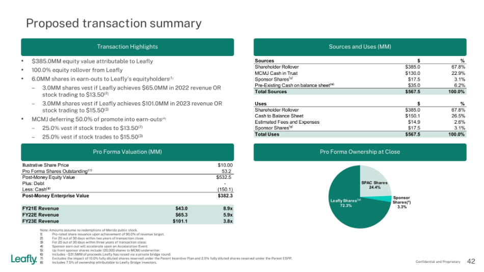 • Existing Leafly shareholders will roll 100% of their existing stake in Leafly and, upon closing, are expected to own approximately 72% of the combined company on a pro forma basis, assuming the company receives 100% of the proceeds currently held in trust.