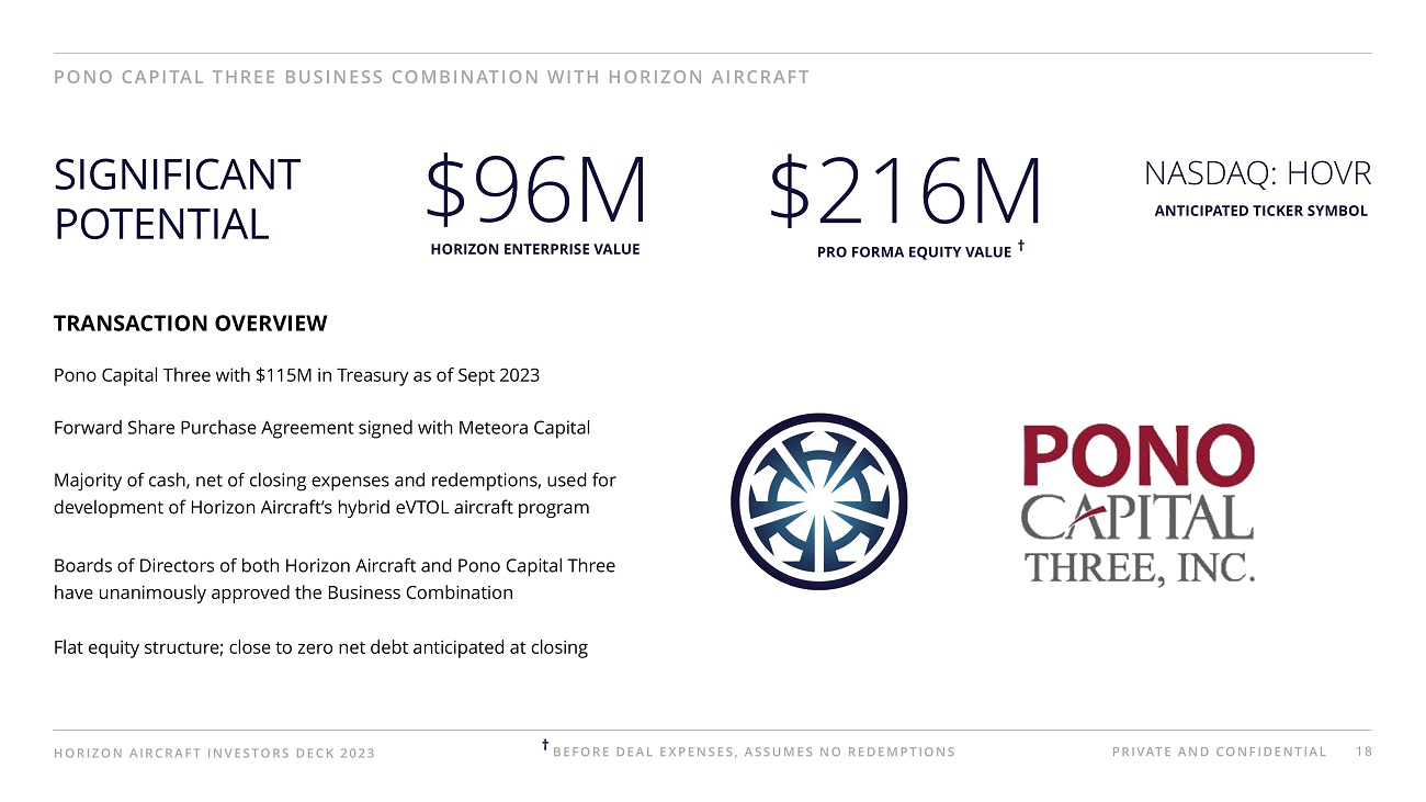 • The transaction values Horizon Aircraft at $96 million, which is expected to result in a combined pro forma equity value of approximately $216 million before expenses, assuming no redemptions in the Business Combination.
