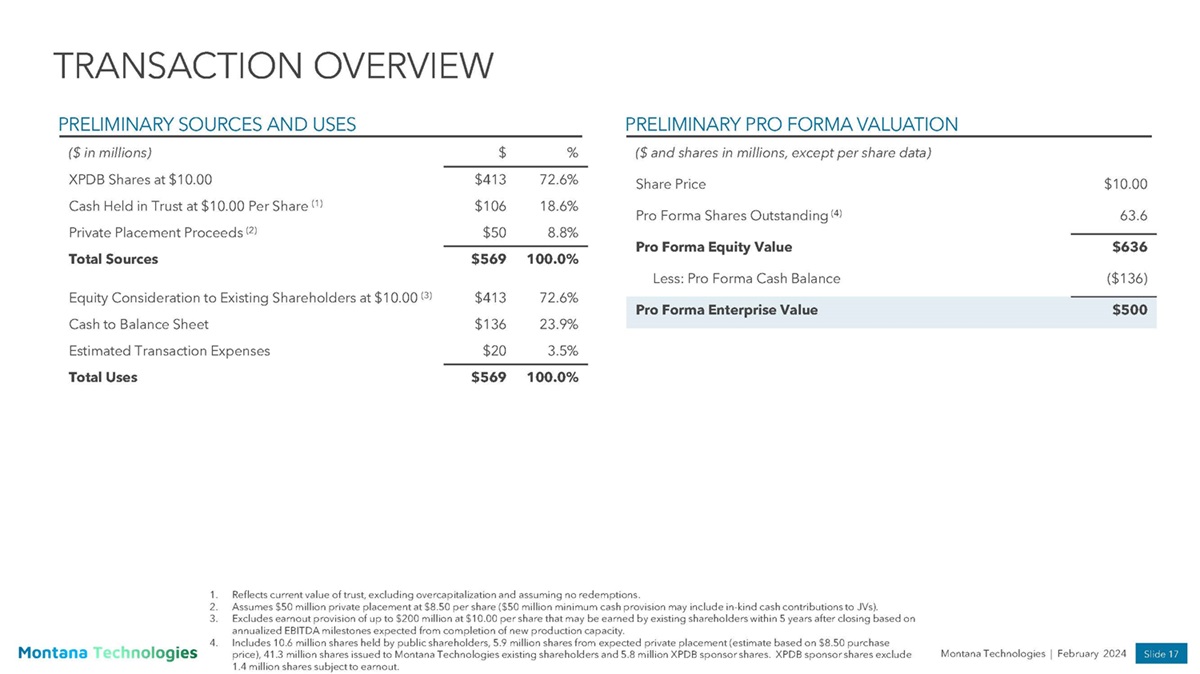 • Business combination of XPDB and Montana Technologies at pro forma enterprise value of $500 million