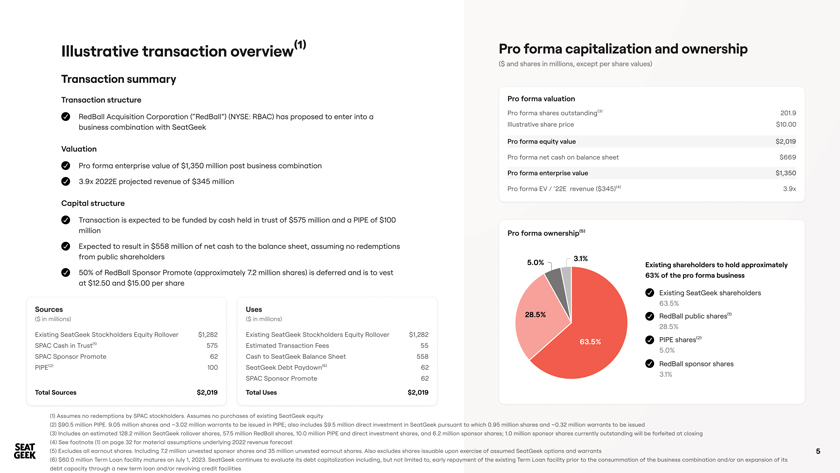 • A $90.5 million from a committed private placement of common stock of RedBall, priced at $10.00 per share, and $9.5 million from a committed private placement of a warrant to purchase 950,000 shares of SeatGeek common stock (collectively, the “PIPE”).