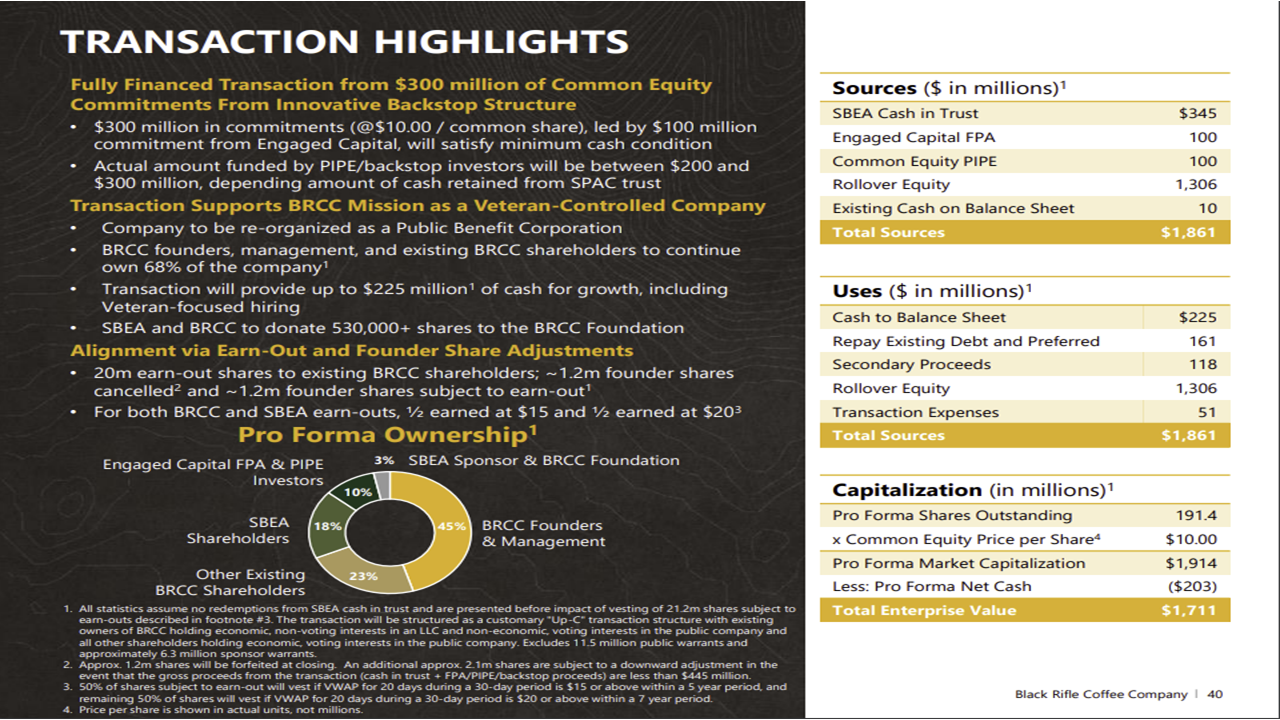 • The transaction is expected to place up to $225 million on Black Rifle Coffee’s balance sheet to accelerate the Company’s growth and will be funded by a combination of up to $345 million of cash held in the trust account of SBEA (assuming no redemptions of SBEA’s Class A common stock), and equity commitments totaling $300 million (the “Equity Commitments”) at $10 per common share from various accredited investors, including a $100 million commitment from Engaged Capital.