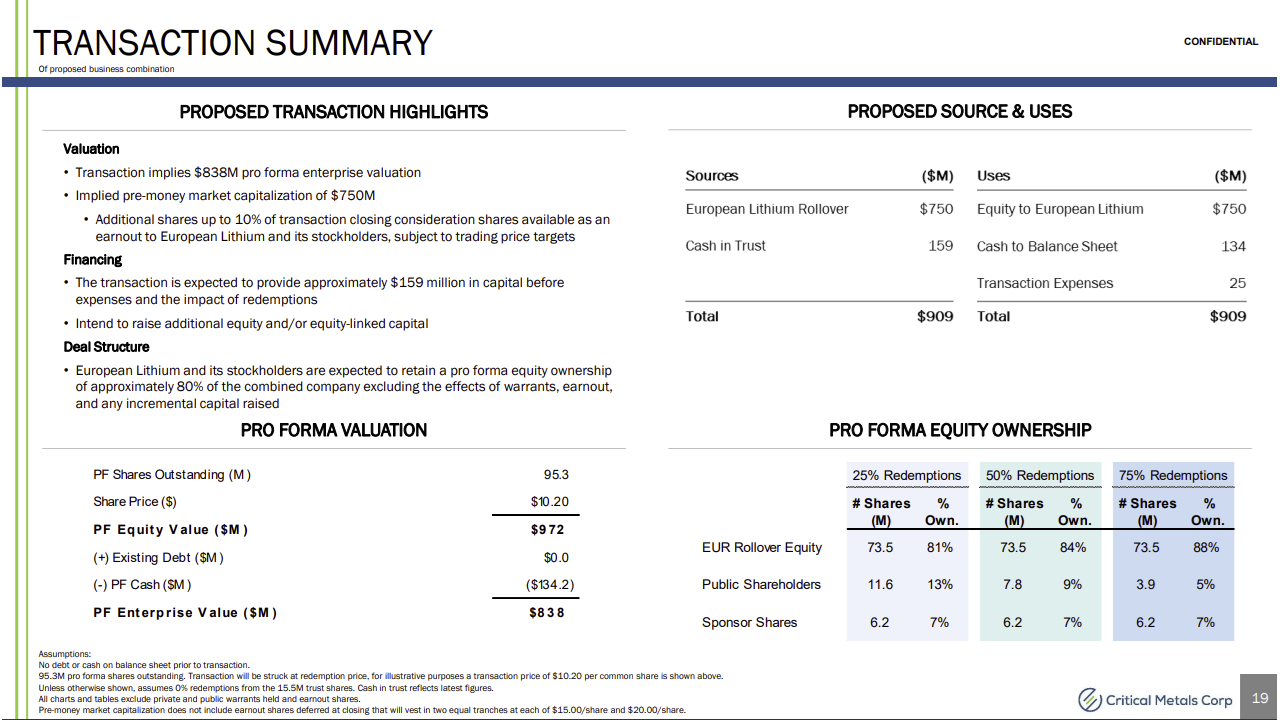 - At closing, Critical Metals will issue 1,000,000 Pubco Shares, warrants for another 1,000,000 shares, and 3,000,000 additional shares, subject to conditions and transfer restrictions.
