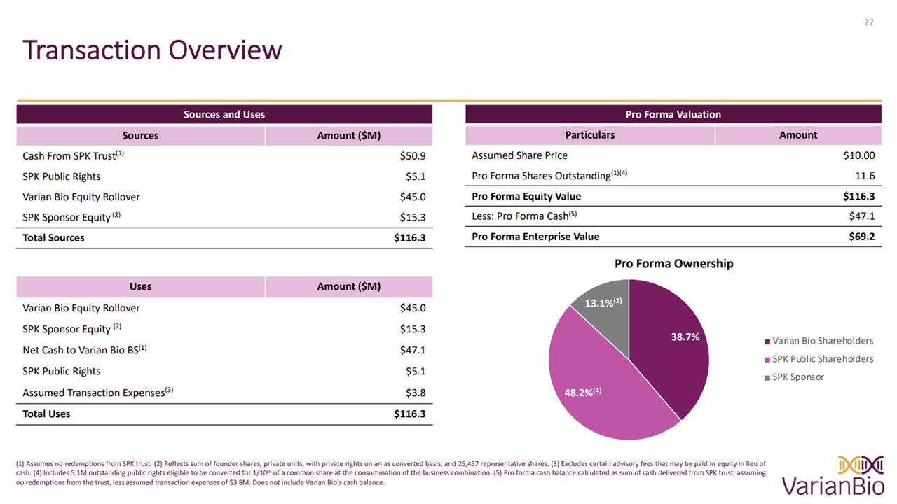 - SPK, which currently holds approximately $50 million in gross proceeds from the trust account, will be renamed Varian Biopharma, Inc. following the merger.