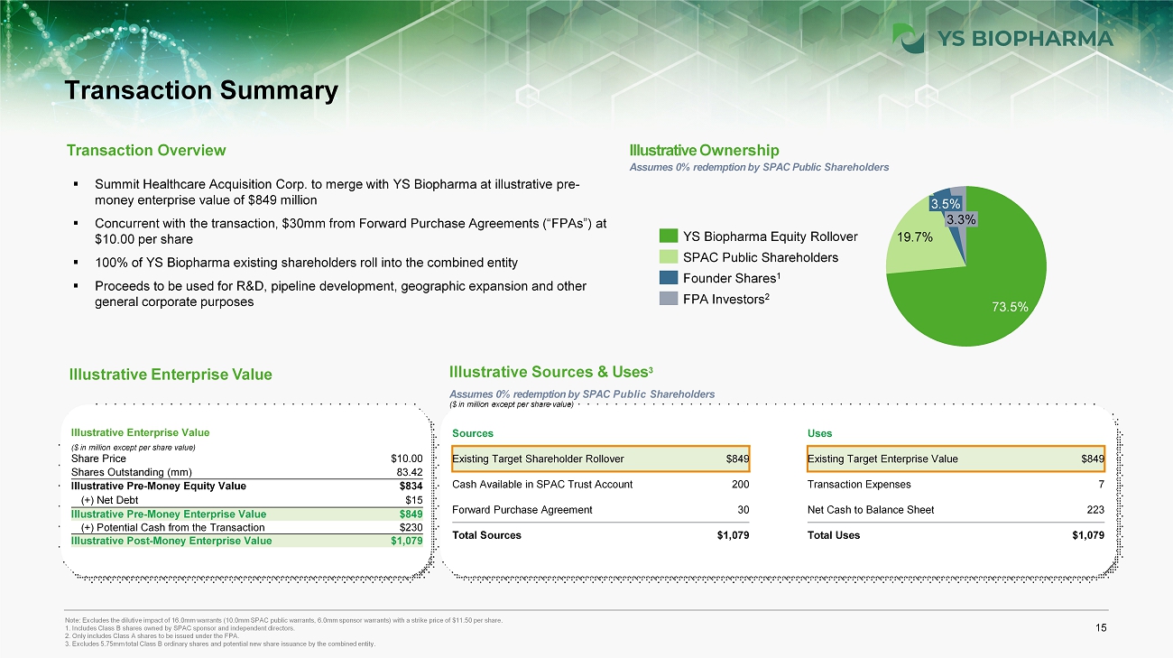 • The business combination is expected to provide up to approximately $230 million in gross proceeds to YS Biopharma, including $30 million from Forward Purchase Investors and up to approximately $200 million currently held in Summit’s trust account, assuming no redemption from Summit’s existing public shareholders.