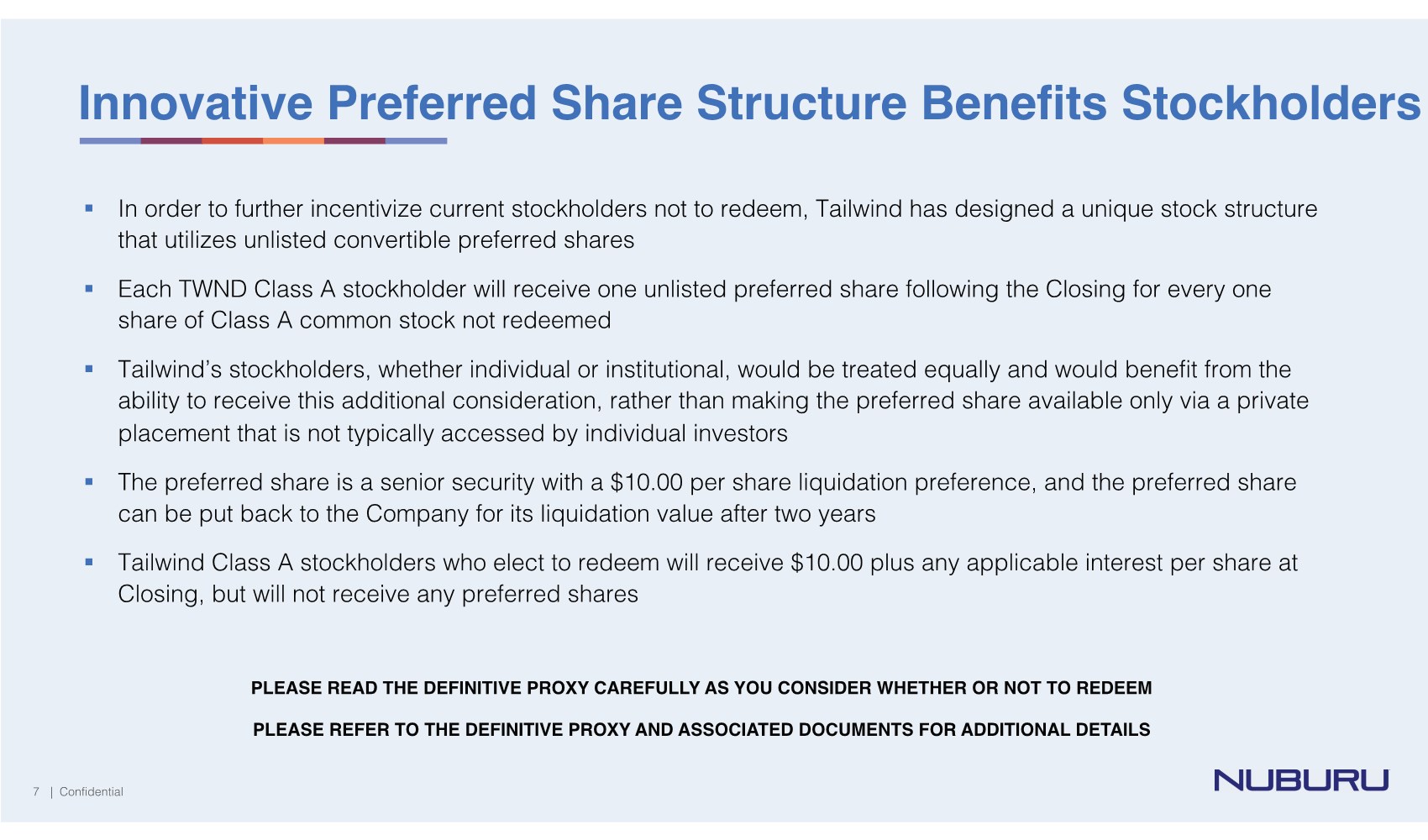 - It is anticipated that the combined company will receive approximately $280 million of gross proceeds from a fully committed common stock PIPE offering of $180 million, along with approximately $334 million cash held in trust, given approximately $200 million in cash acquisition costs, and assuming minimal redemptions by Tailwind’s existing public stockholders.