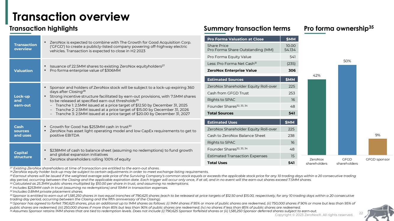 • Assuming that no public shareholders of Growth for Good redeem their shares, ZeroNox’s existing shareholders are expected to own ~40% of the pro forma company at close. As of today, Growth for Good holds ~$253 million of cash in trust from its initial public offering in December 2021.