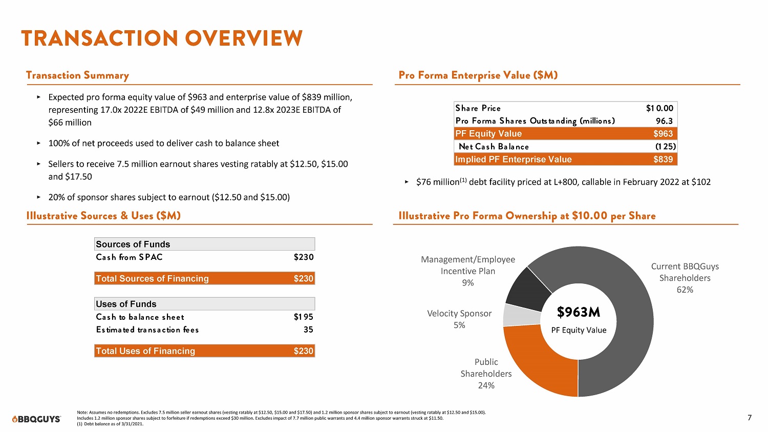 - The transaction implies a pro forma enterprise valuation for BBQGuys of $839 million, or 17.0x projected 2022 pro forma Adjusted EBITDA of $49 million. Estimated cash proceeds to the Company from the transaction are expected to consist of Velocity’s $230 million of cash in trust (assuming no redemptions).
